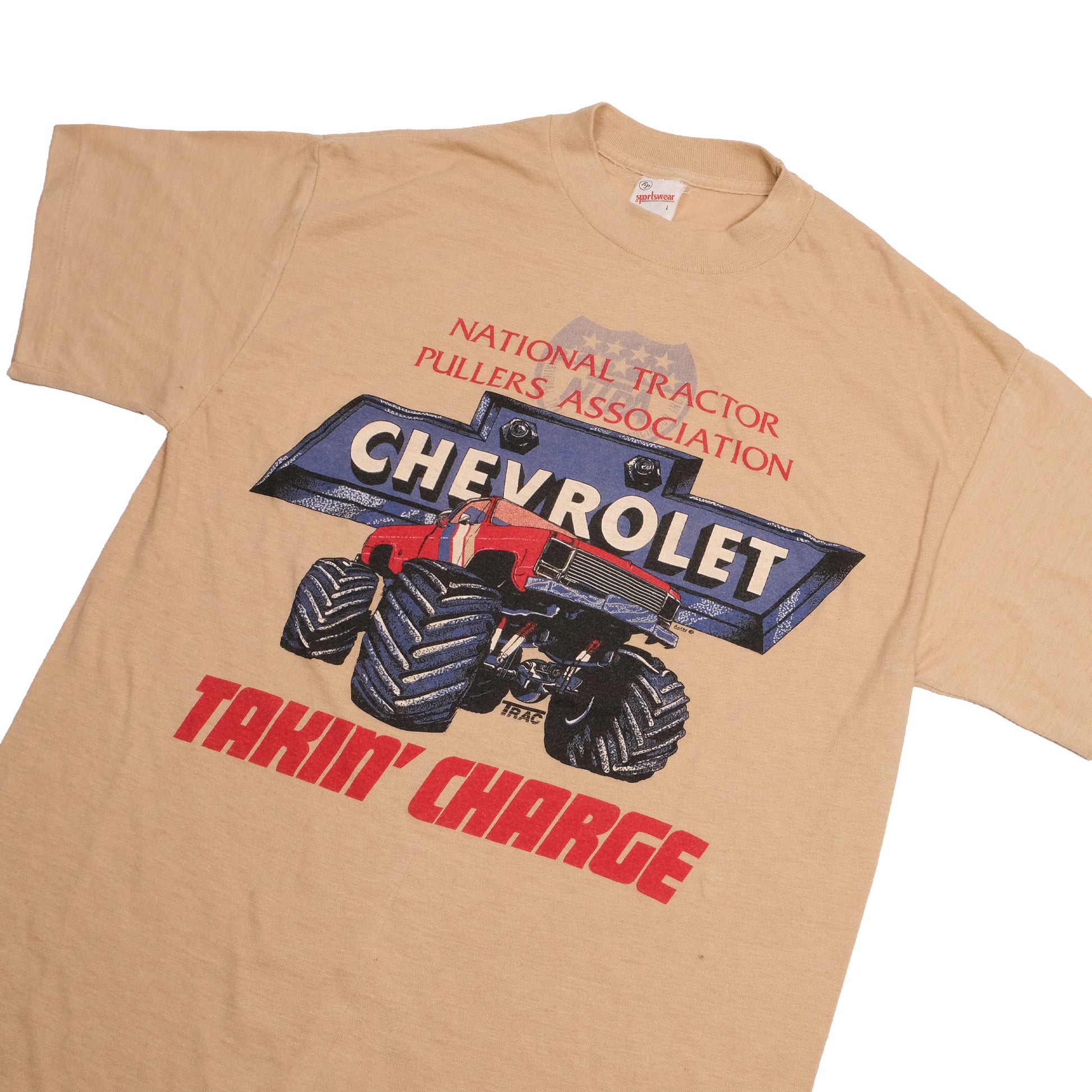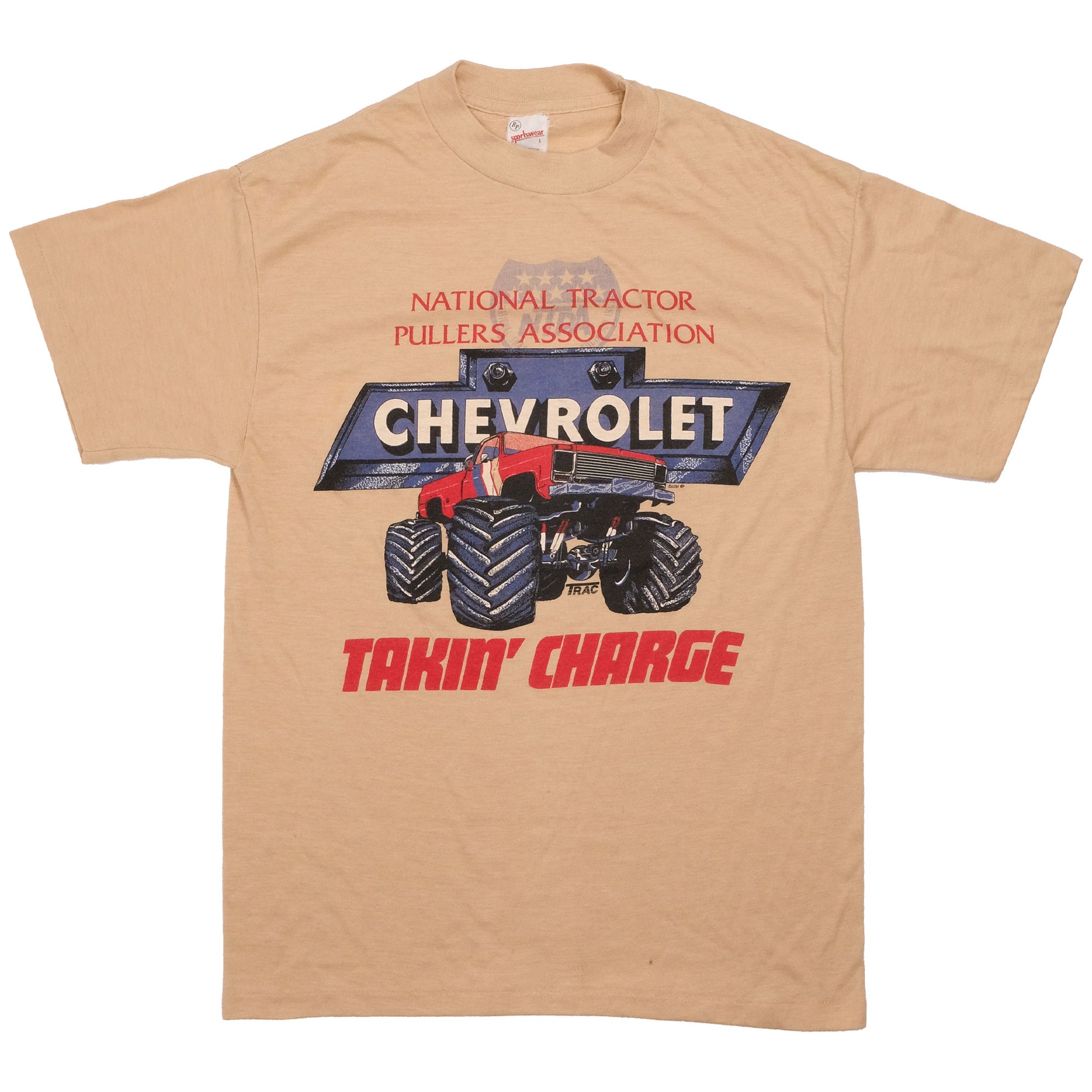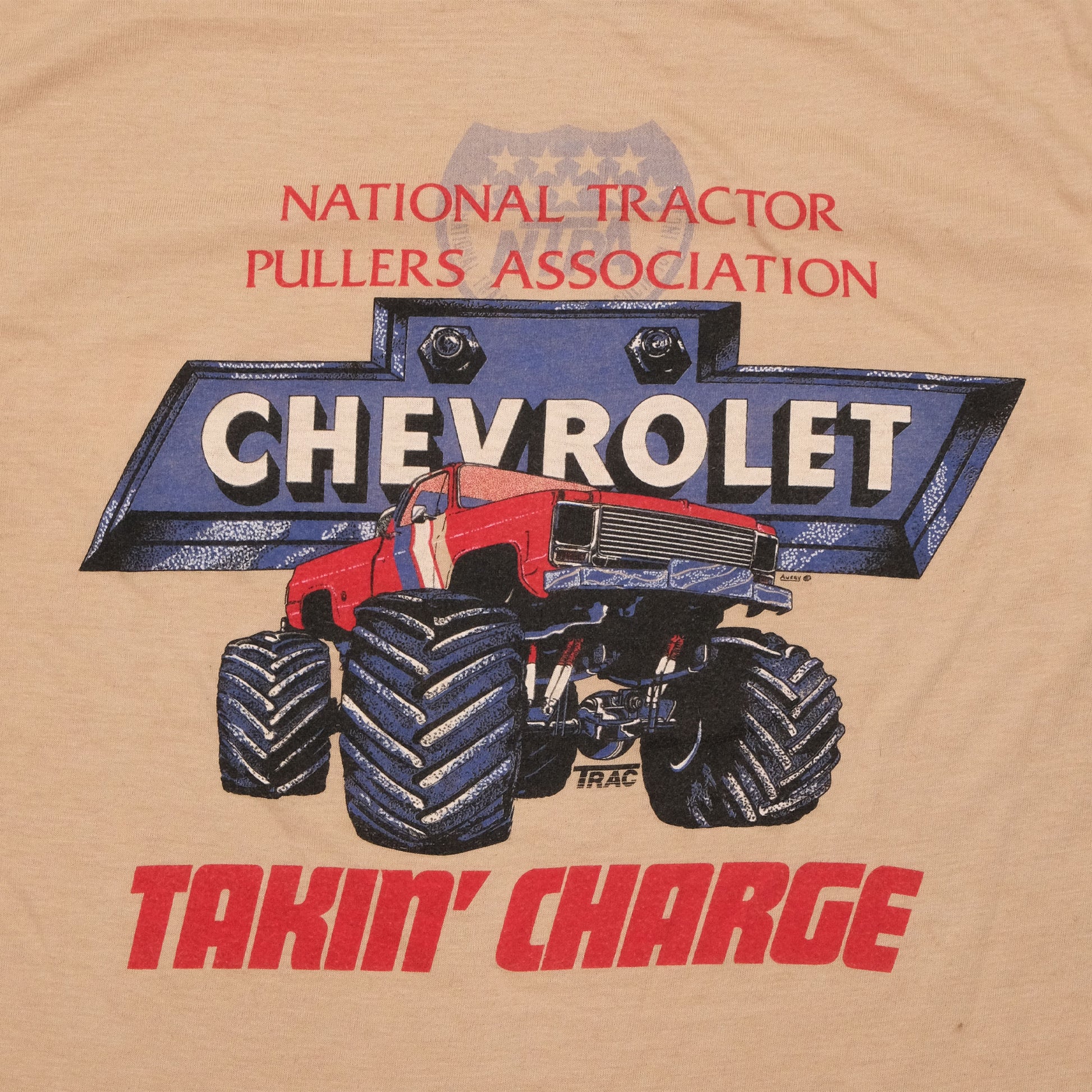 Chevy Takin Charge! A classic Chevy monster truck representing the National Tractor Pullers Association. There are a couple small spots on the front (view photos to see) as to be expected with a 40yr old tee.