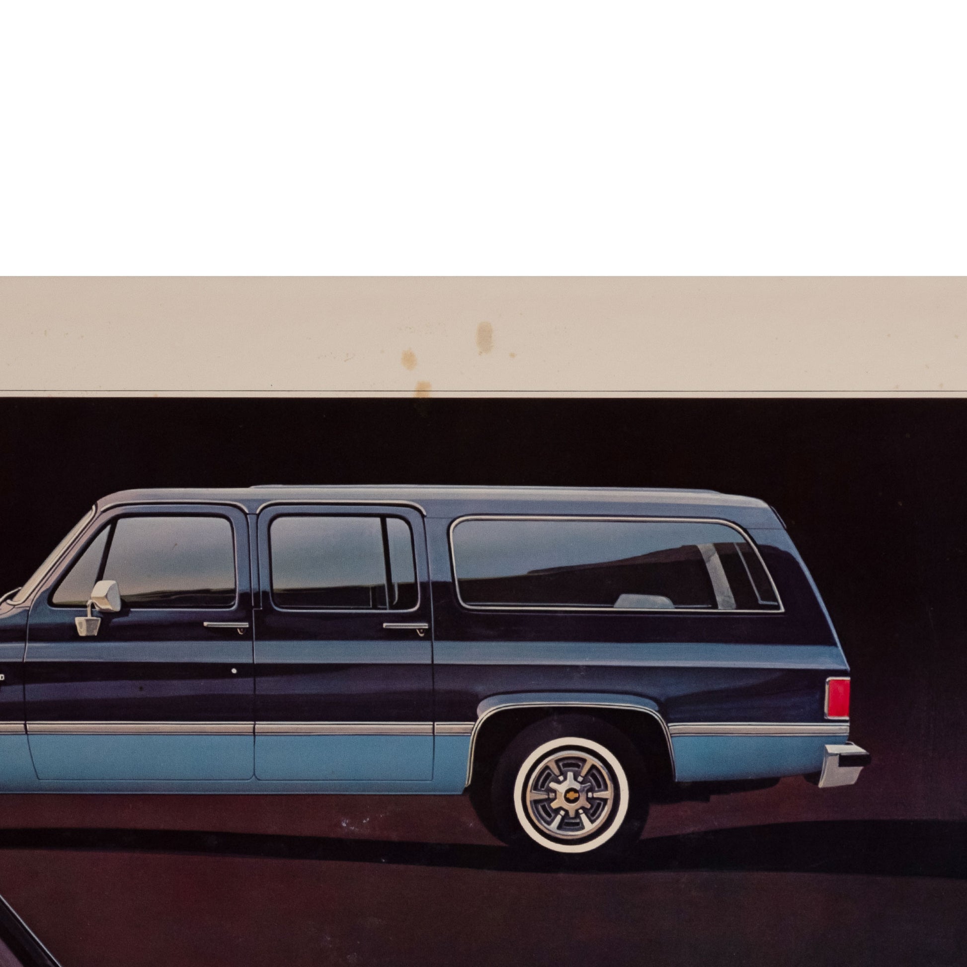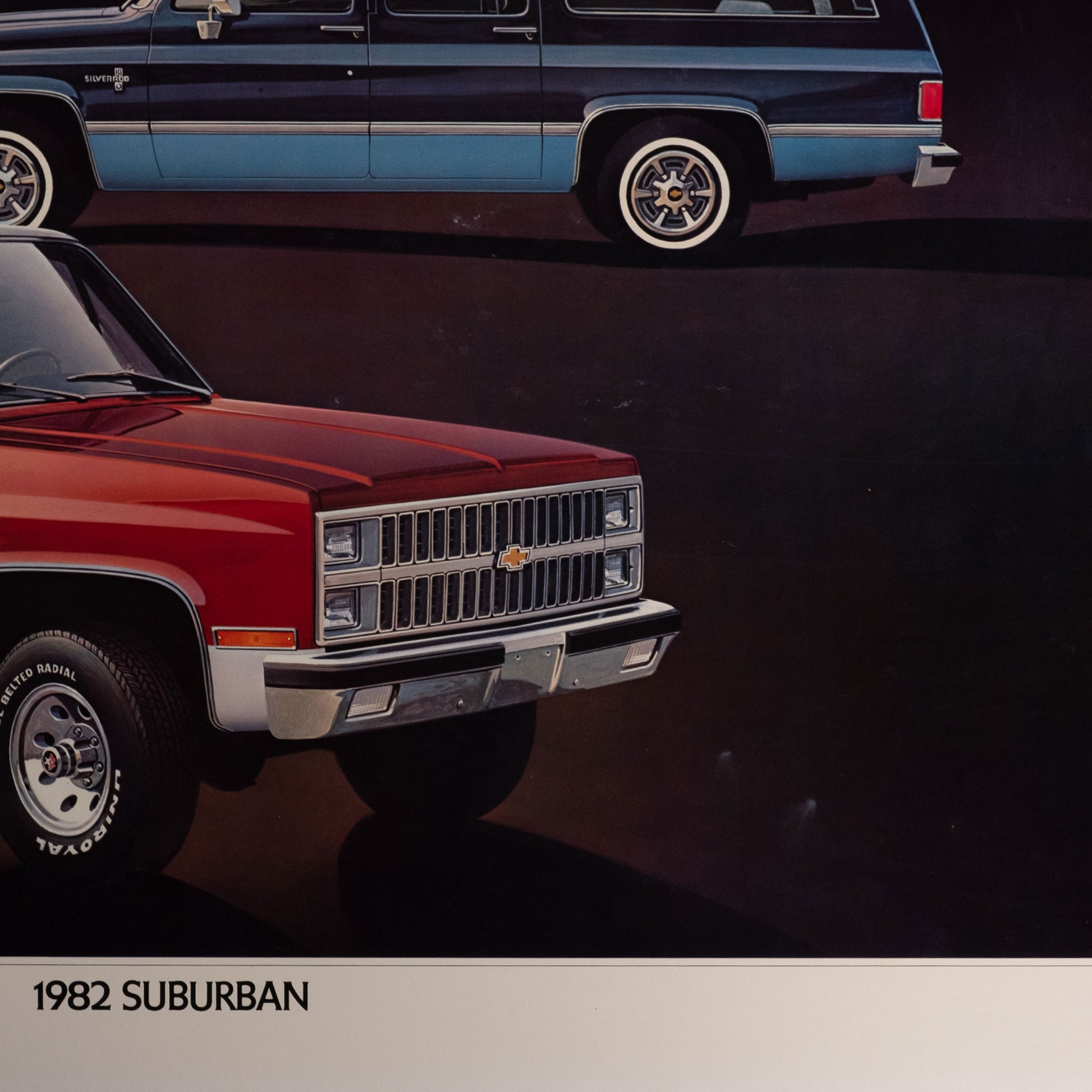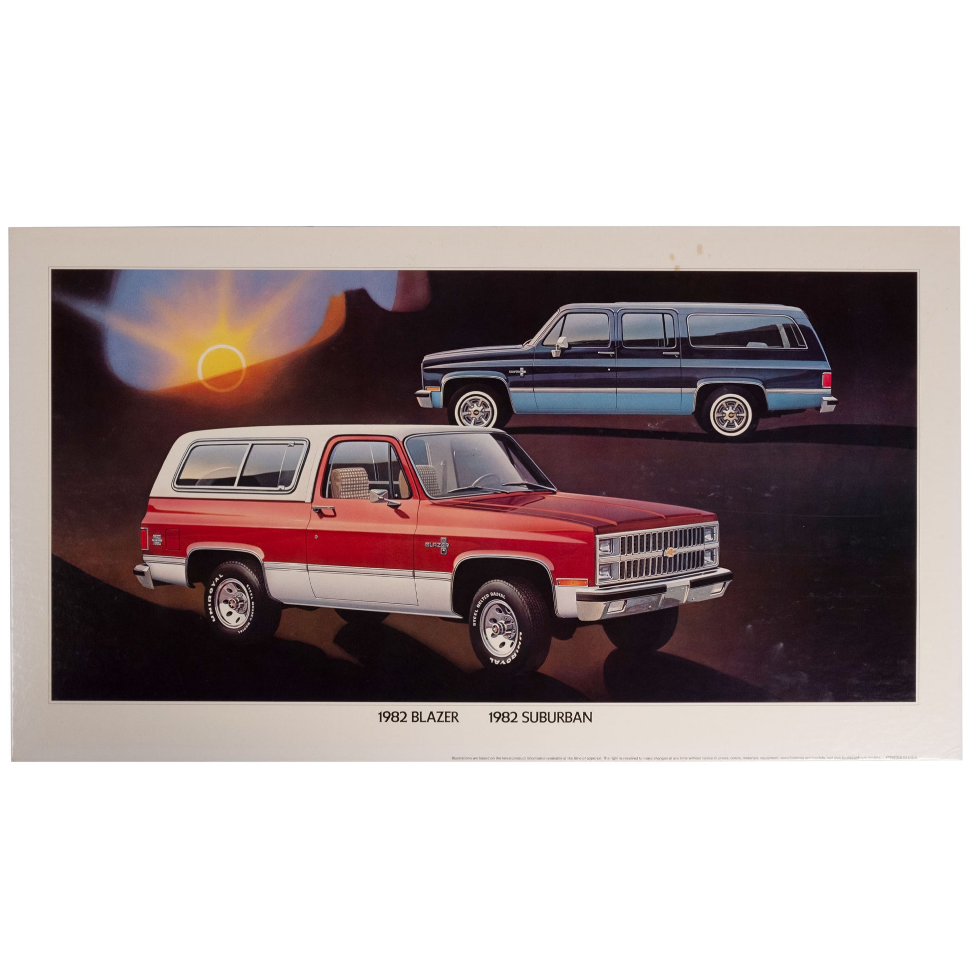 1982 Chevy Blazer & Suburban Dealer Promotion, some discoloring on the border and a few marks on the darker areas of the print. Overall in good shape.